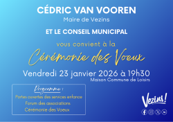 CÉRÉMONIE DES VŒUX - VENDREDI 23 JANVIER Vendredi 23 janvier, venez à la rencontre de vos élus lors de la Cérémonie des Vœux ! Découvrez les services dédiés à l’enfance et échangez avec les professionnelles qui les font vivre. Rencontrez les associations de votre commune : activités, périodes d’adhésion et nombreuses opportunités de bénévolat. Assistez aux vœux de Cédric Van Vooren, Maire de Vezins, et de son équipe municipale. La soirée se conclura par un…