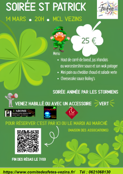 SOIRÉE SAINT-PATRICK Dernière semaine pour réserver ! Le comité des fêtes de Vezins vous invite à célébrer la Saint-Patrick dans une ambiance festive et conviviale aux couleurs de l’Irlande. Samedi 14 mars À partir de 20h MCL de Vezins Réservations via le QR code ou le mardi au marché (Maison des Associations) ou en ligne : comitedesfetes-vezins.fr