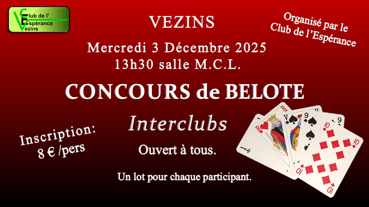 3 décembre 2025 : Concours de Belote Interclubs ouvert à tous.