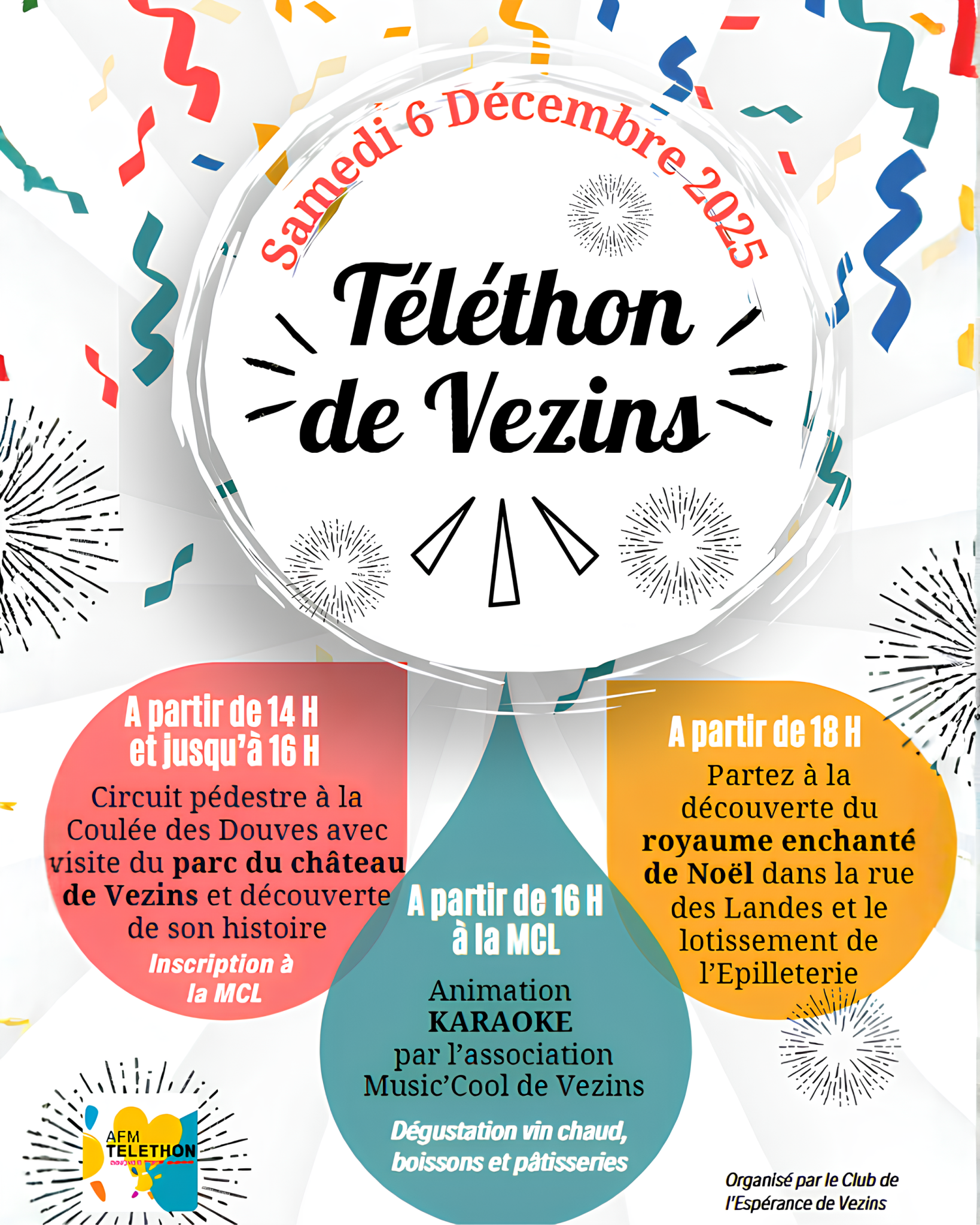 6 décembre 2025 : Journée Téléthon « Les Maisons illuminées ». Animation l’après-midi avec « Music Cool » et vin chaud le soir.